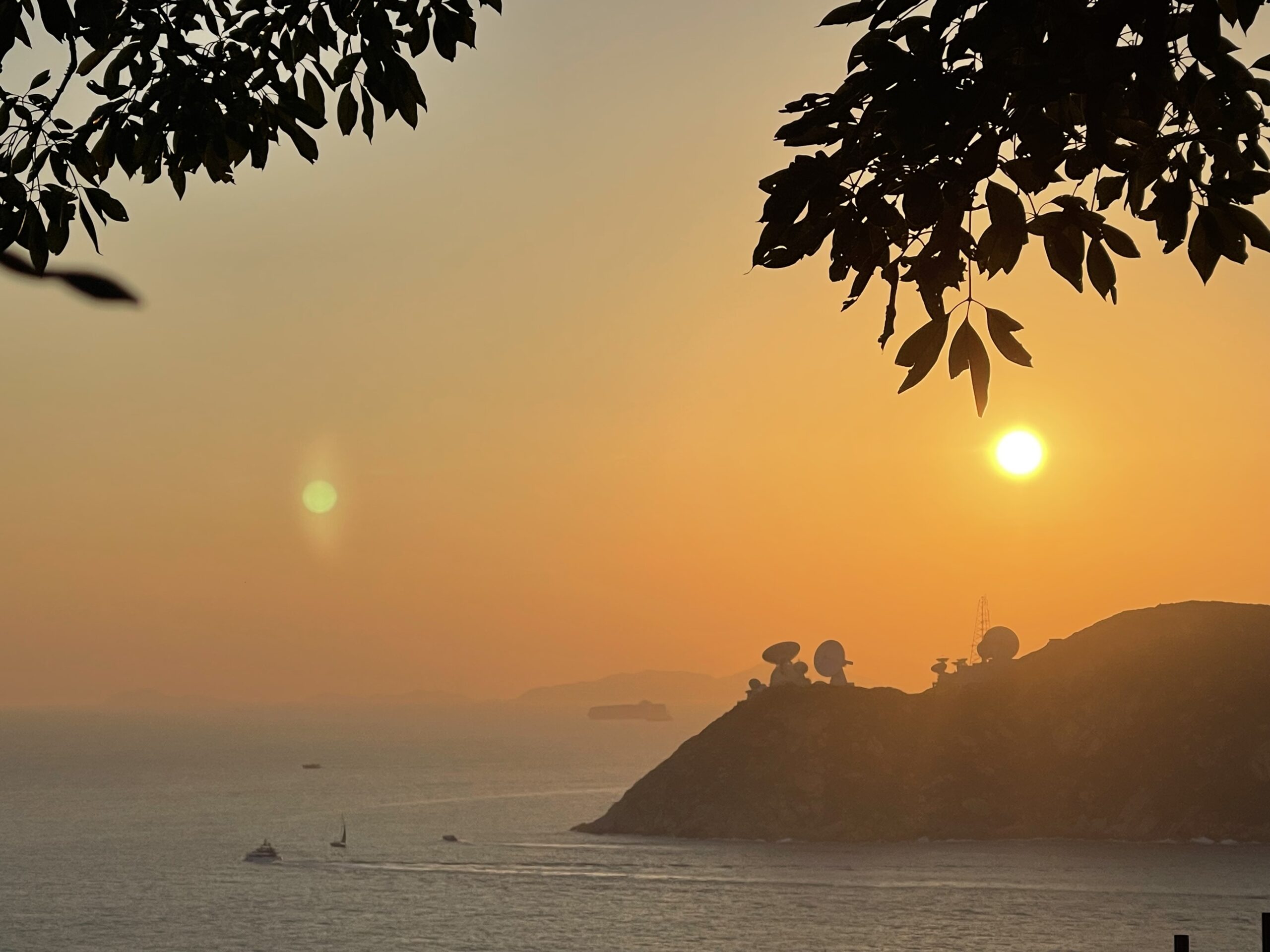 遠處,夕陽西下,微波粼粼,,游艇行於似金色翡翠海上的景致,又提醒著我,這近黃昏,該回去了,我便寫下「鶴咀風光無限好