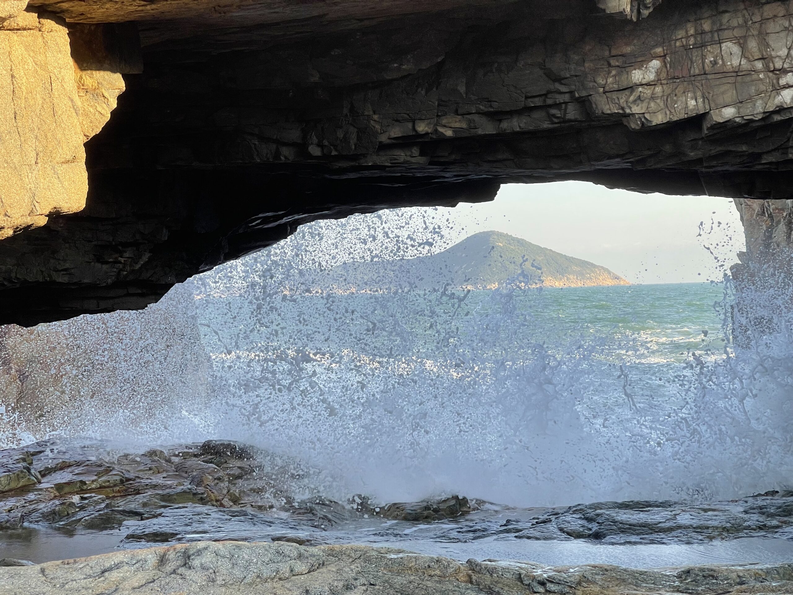 我還在欣賞該標本時,轉眼之間,同伴不見了,哦,他們給一個天然形成洞吸引了,這個洞稱為鶴咀蟹洞,海浪每日將岩石鑿洞,而形成呢個似蟹型嘅洞口,打卡拍照人挺多呀!輪到我們時,已經等了好久了,我们便盡情的拍,拍照時,洞連海,海浪時猛時弱拍打著礁石,浪花有時候還會漫過拍照人腳踝,海浪衝擊礁石濺起象珠子般的水花,打在人的身上,海浪激起的泡沫,像姑娘卷卷的頭髮,美麗極了,給人一種種遐想無限特別的感覺,我隨即把所拍短視頻發朋友圏還寫上「蟹洞浪花,捲起千堆雪」,同行的暨南大學駐港副主任林高野在我微信朋友圈該文下留下「雷音水霧 彈出萬個曲」,這也看出以句表他此行的心情吧!