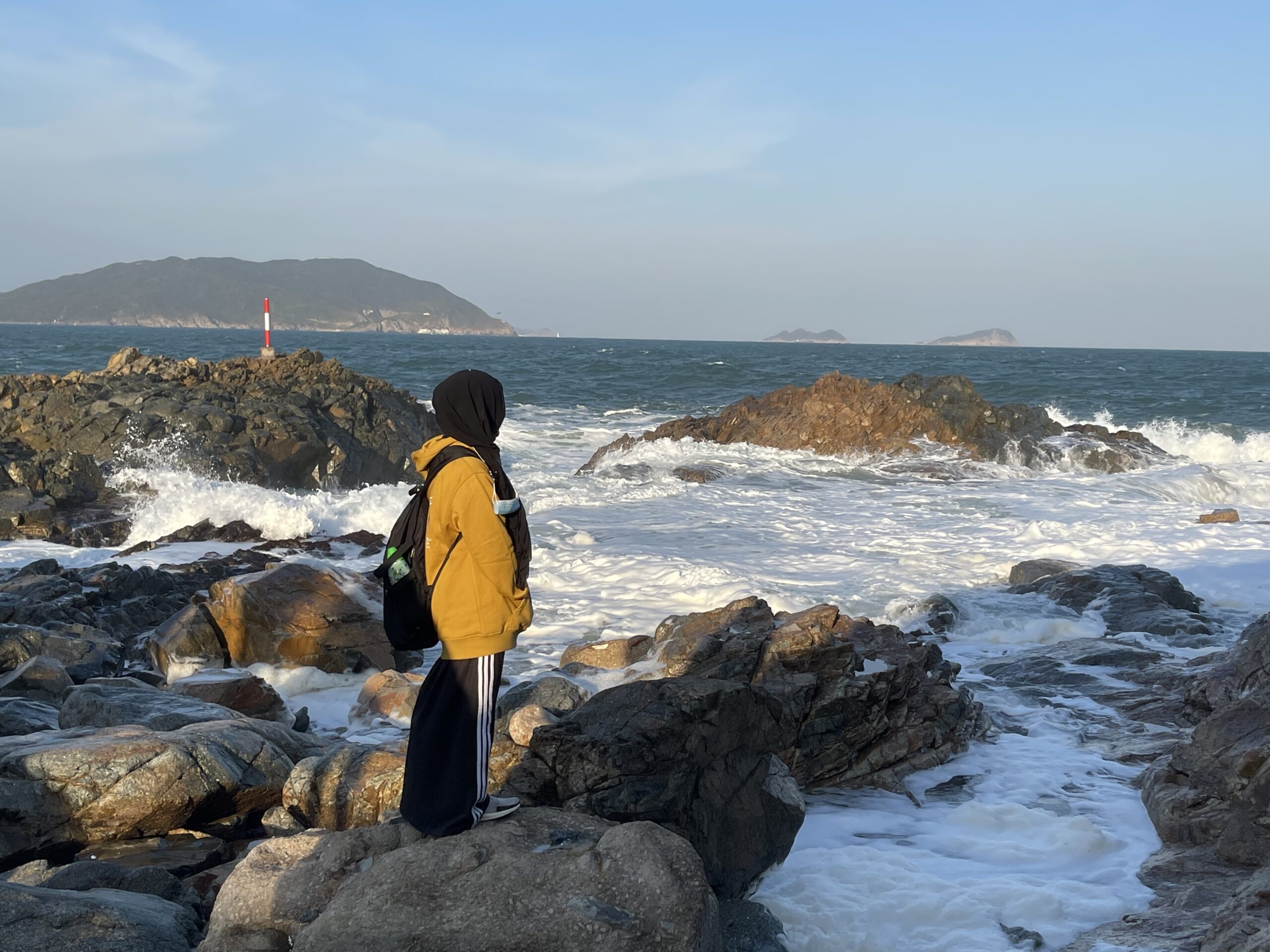 我們來到蟹洞旁海邊岩石上時,海浪拍打著、衝擊著,這海天礁石,偶爾也有鳥驚過,幾個裹著穆斯林外套的外傭也在拍照,這一道道似雪花般淡淡的浪花飄蕩蕩到礁石上,「嘩!嘩!」海浪拍打著礁石,捲起了幾尺高的潔白晶瑩的水花。又一道道海浪撞擊岩石發出陣陣頃刻間「轟轟隆隆」,浪濤足有幾米高,潮聲似千聲鳴谷,萬雷驚澗,氣勢壯觀極了,陣陣浪花親吻著我腳下礁石,海浪湧到礁石上,又輕輕地撫摸著岸邊的礁石,又依依不捨地退回。一切帶走了我的疲勞,刺激著我的心扉,隨即在微信朋友圈發出了照片和一首打油詩