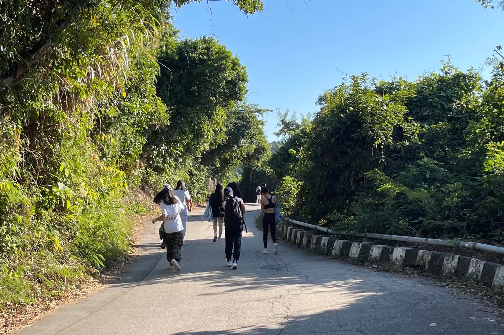 沿著鶴咀道向下一邊走一邊欣賞自然風光景色,一會兒到鹤道左邊有一個寫「鶴咀村」路牌,路牌上還寫著信記士多,但我們看人群都向前走,我們便沒有拐入村了。
