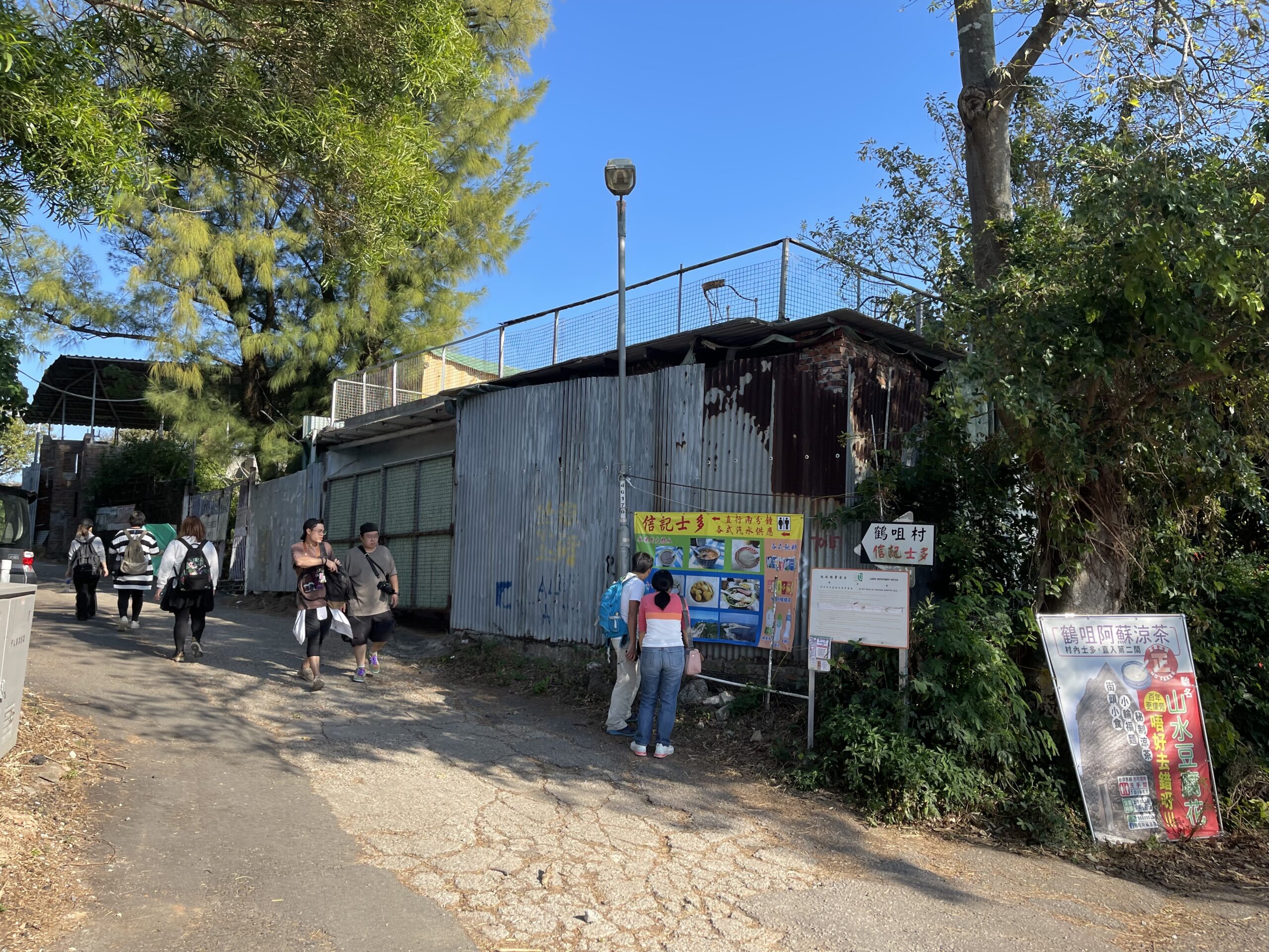 整個村不大,還有汽車改裝廠,在更樓前有兩家士多店,店前擺著幾張台椅,我們問有東西吃嗎?店員說只有水餃,40元港幣5個、一瓶可樂15元港幣,後來,同伴們因廁所太髒不敢上了,自然我們也沒必要購買該店東西,便打道趕回鶴咀車站坐車。