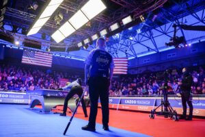 中华时报(美一波特 赵雪湄)2021卡祖莫斯科尼杯九球大赛,目前正在英国亚历山德拉体育场劲爆举行。欧洲队与美国队的角逐进入了白热化阶段。美国队目前以微弱优势领先。总比分暂时为5-4