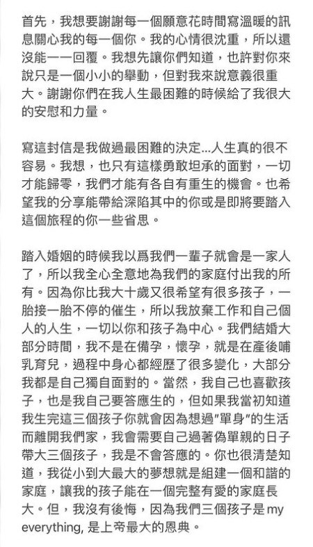 李靚蕾表示,未來將會善待自己並成為孩子的堅強倚靠和最好的榜樣,讓他們知道人生就算跌到了谷底一樣可以靠自己的力量再爬起來,「接下來的日子不會容易,但我會倚靠上帝和隧道深處的光,還有每一個陪在我身邊的你們,勇敢的一步一步走下去。」