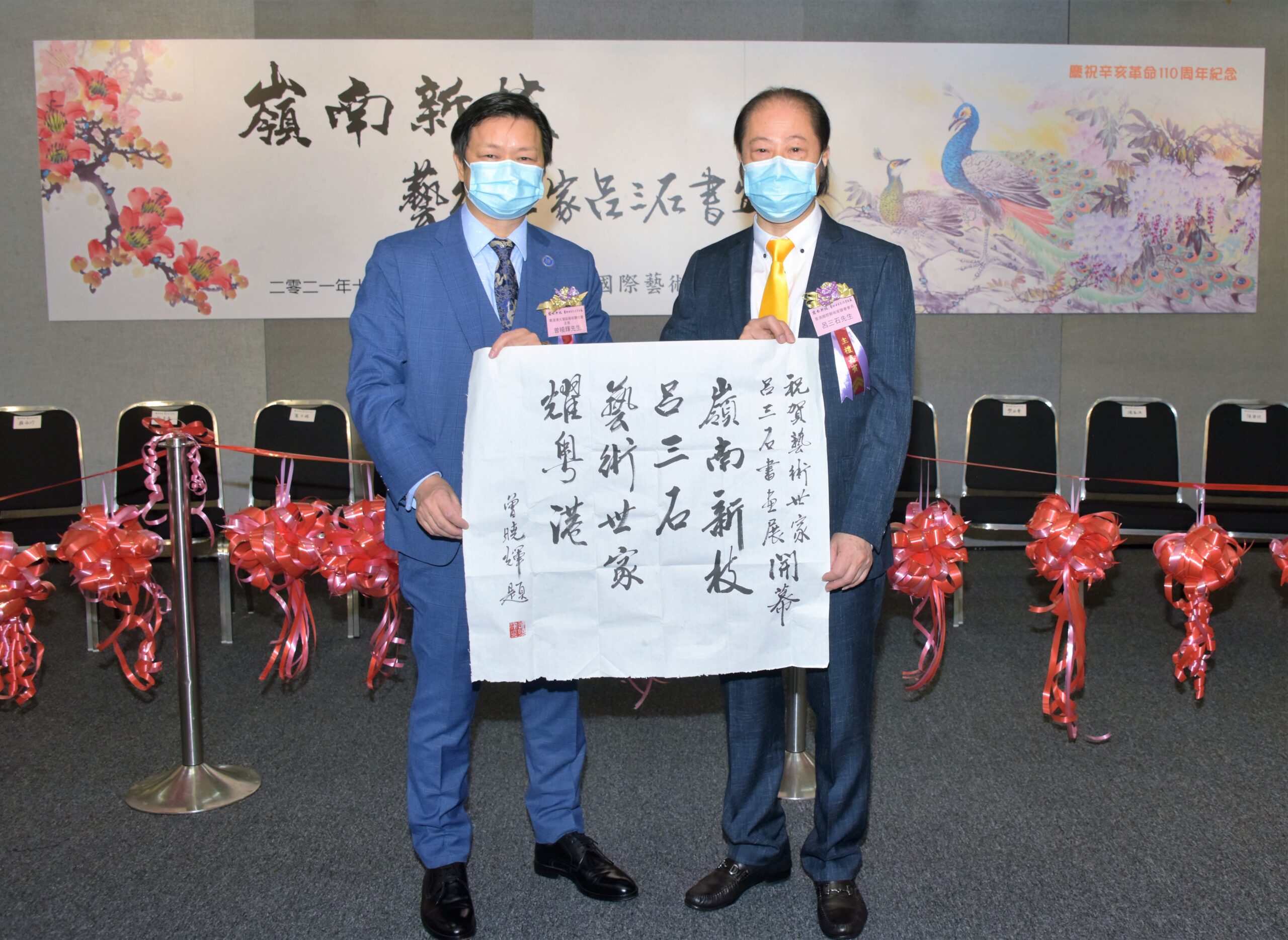 曾曉輝在開幕式上,贈送一張書法「嶺南新技呂三石 藝術世家耀粵港」給呂三石先生以祝賀書畫展成功。