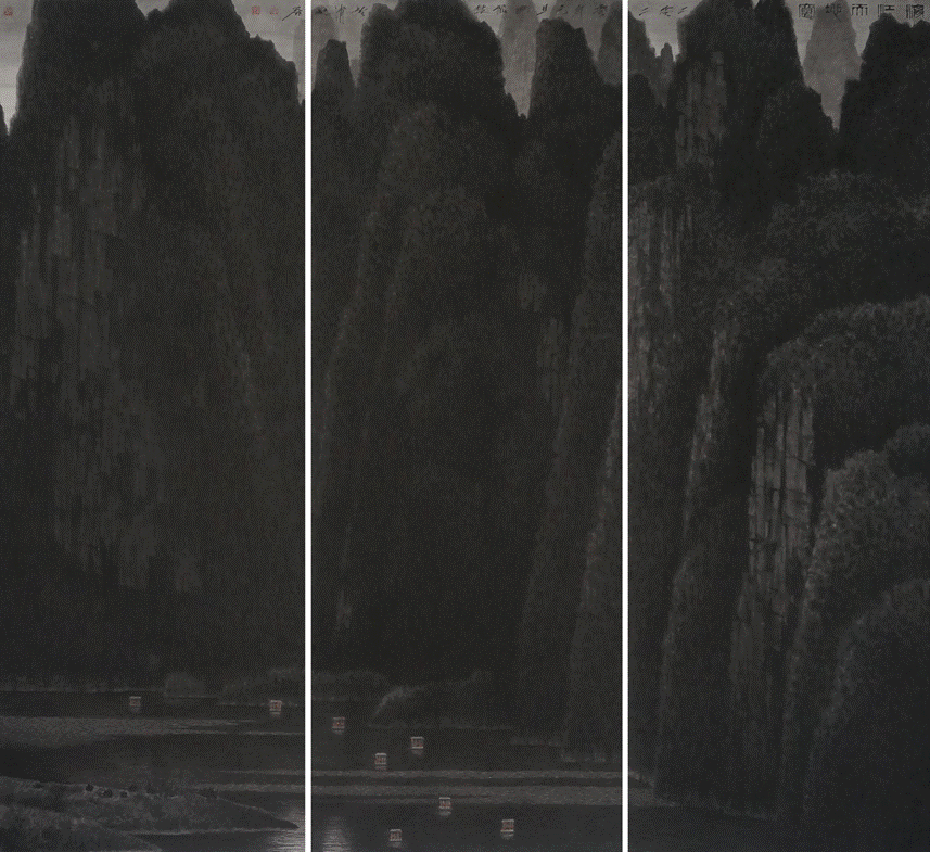 「可染先生題畫常引用石濤語「墨團團裡黑團團,墨黑團裡天地寬」,顯然,前輩們努力用濃黑的墨色去表達豐富深邃的意境。我隨他們而行,忘乎所以,完成了這幅幾乎沒有留白的灕江山水。」黃孝達如是說。