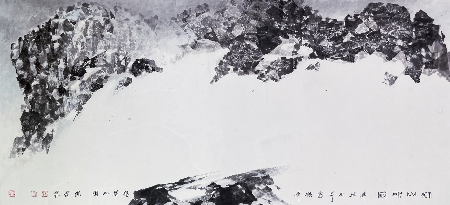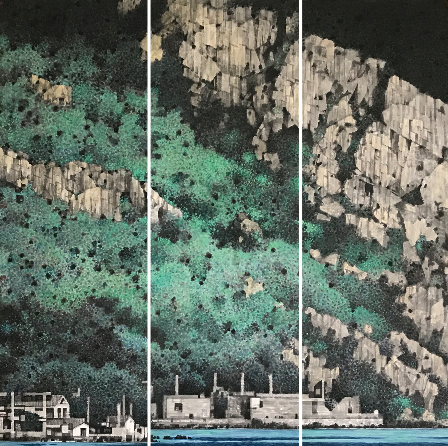 畫家對重巒疊嶂的墨色渲染,拿捏得恰到好處,每層山巒都有微妙的漸變色系,呈現出細密的肌理、層次,可近視,宜遠觀,而遠觀則更顯磅礴大氣。