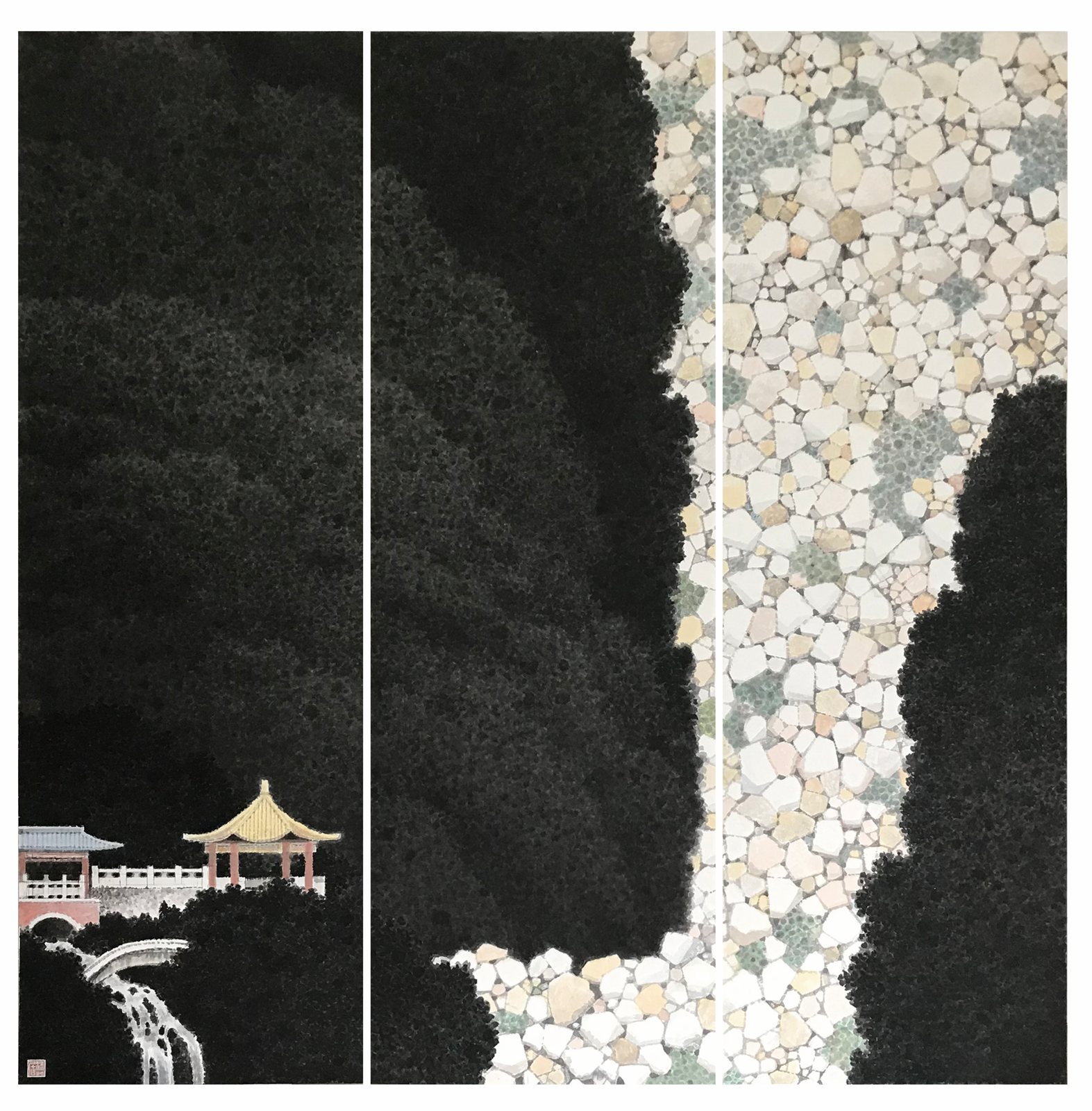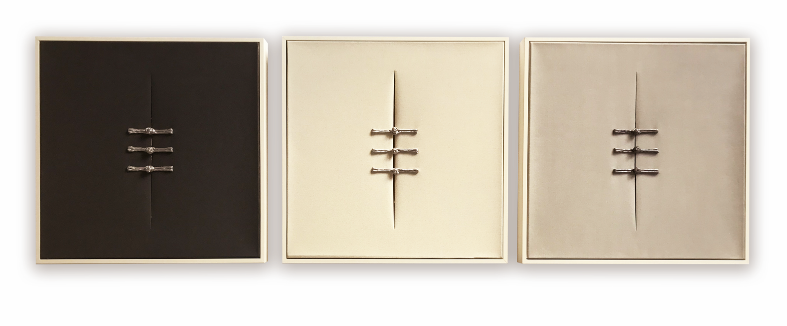 是極簡主義的新嘗試。在三幅中間剖開的畫面,各釘了三排中式紐扣,我們看見「極端」與「中庸」;「切割」與「聯結」;現代文明的「破」和傳統觀念的「立」。
