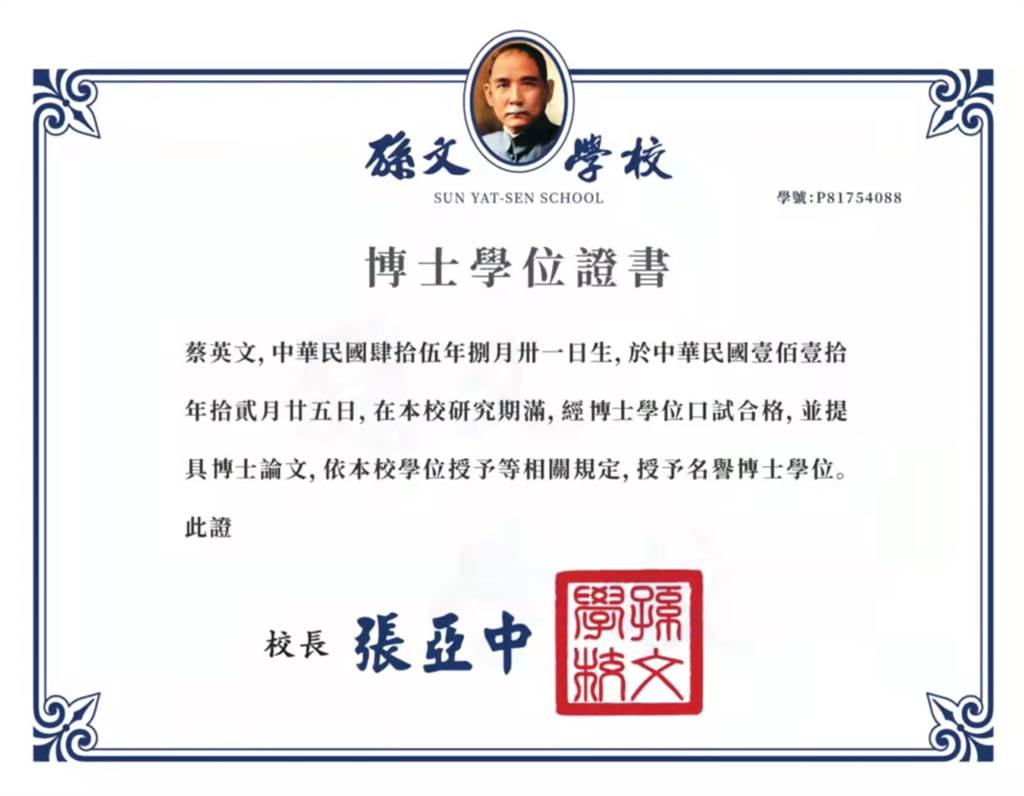 另外,孫文學校臉書粉專今也公布一張「蔡英文博士學位證書的NFT」,同步上架全球最大的NFT交易平台Open Sea。孫文學校總校長張亞中辦公室主任何啟聖表示,蔡英文論文真偽紛擾多時,除了蔡個人面對誠信的道德危機,全體國人也深陷高度的國安威脅,即然就缺這張證書,那就發給她,好讓爭議早日平息。