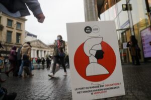 2021年12月27日,人们在比利时布鲁塞尔市中心的商业街购物。由于奥密克戎感染病例激增,比利时进一步收紧防疫限制措施,包括关闭电影院、剧院和音乐厅,禁止室内活动,限制商店购物人数等。(新华社记者郑焕松摄)