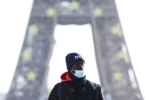 1月5日,一名售卖纪念品的小贩走在法国巴黎埃菲尔铁塔附近的特罗卡德罗广场上。(新华社记者高静摄)