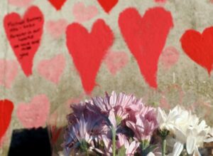 1月13日,鲜花摆放在英国伦敦泰晤士河畔的国家新冠纪念墙边。(新华社记者李颖摄)