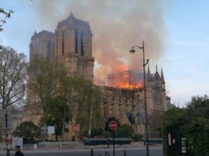 图为2019年4月15日,在法国巴黎,巴黎圣母院燃起大火。(新华社记者徐永春摄)