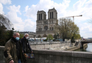 图为2021年4月16日,人们走过修复中的法国巴黎圣母院。(新华社记者高静摄)