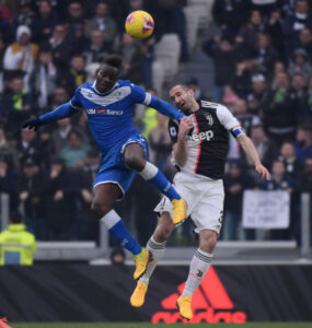 2020年2月16日,尤文图斯队球员基耶利尼(右)在比赛中与布雷西亚队球员巴洛特利争顶。新华社发(阿尔贝托·林格里亚摄)