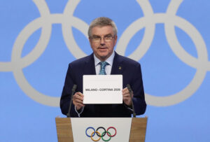 2019年6月24日,国际奥委会主席巴赫宣布意大利米兰/科尔蒂纳丹佩佐获得2026年冬奥会举办权。新华社记者曹灿摄