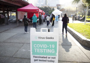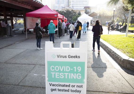 图为2022年1月19日,人们在美国旧金山的一处新冠病毒检测点排队检测。新华社发(李建国摄)