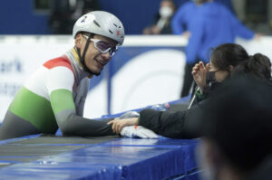 2021年11月20日,2021-2022赛季国际滑联短道速滑世界杯匈牙利站男子500米决赛,匈牙利选手刘少林(左)在比赛后和教练张晶庆祝胜利。新华社发(弗尔季·奥蒂洛 摄)