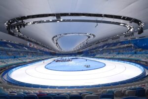北京冬奥会速度滑冰比赛场馆——国家速滑馆“冰丝带”,运动员们在训练中。新华社记者武巍摄