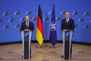 2021年12月10日,在比利时布鲁塞尔,德国总理朔尔茨(左)访问北约总部并与北约秘书长斯托尔滕贝格共同出席记者会。(新华社记者郑焕松摄)
