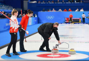 2月2日,北京冬奥会冰壶混双循环赛在北京国家游泳中心“冰立方”开赛,中国冰壶队范苏圆(左二)在中国队迎战瑞士队的比赛中。新华社记者刘续摄