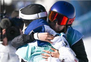 金牌到手的谷爱凌没有离场,而是走到对手身边,轻抚苔丝的后背进行安慰。