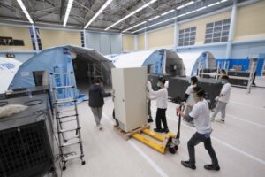 19日,一组“猎鹰号”硬气膜实验室及相关设备等超840件物资紧急从内地运往香港码头。20日上午10时,“猎鹰号”硬气膜实验室在香港九龙公园体育馆开始搭建。与此同时,全自动开盖机、自动加样仪、自动核酸提取仪等核心先进仪器,以及PCR扩增仪、掌上离心机、消毒机器人等3000多件相关设施设备及物资开始陆续进场。5个舱位主体搭建完成。