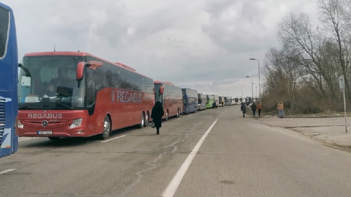 加完油,我们朝着乌克兰西部重镇利沃夫进发,一直朝东行驶70多公里就到。这条双向两车道的公路,对面车道堵满了等待离境的大巴车、私家小轿车,每十来分钟移动几个车身。一些期望进入波兰的乌克兰人说,他们在车上足足等了两天两夜。