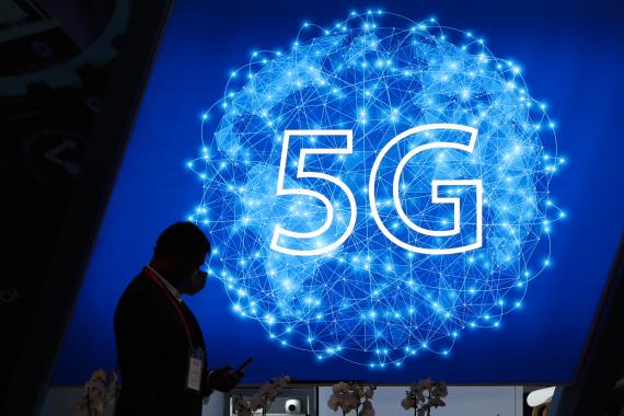 3月3日,在西班牙巴塞罗那2022世界移动通信大会上,一名男子经过一处5G标识。(新华社记者郑焕松摄)