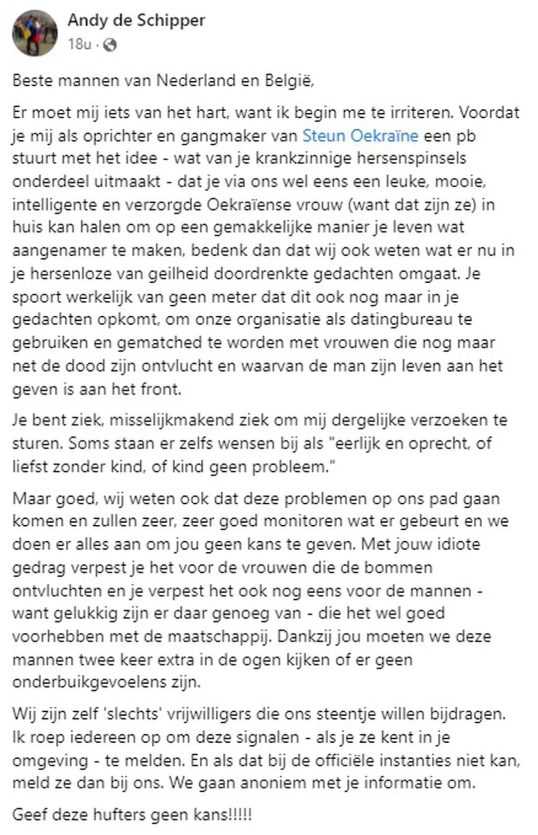 来自Zelzate的Andy de Schipper是 “支持乌克兰”网页的管理员,近来,单身男子在网页上的私信令他感到”震惊”。这些网民申请收留“美丽、聪明的乌克兰女人”。