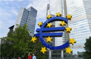 2021年6月28日,人们从位于德国法兰克福的欧元雕塑前走过。新华社记者逯阳摄