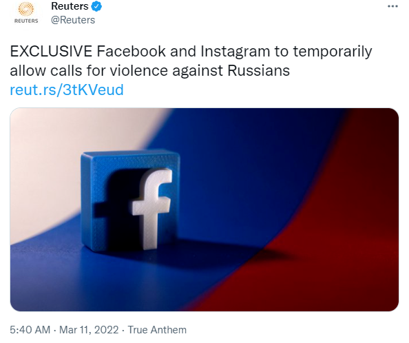 “As a result of the Russian invasion of Ukraine we have temporarily made allowances for forms of political expression that would normally violate our rules like violent speech such as ‘death to the Russian invaders.’ We still won’t allow credible calls for violence against Russian civilians” .