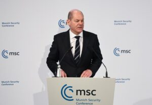 2月19日,在德国慕尼黑,德国总理朔尔茨在第58届慕尼黑安全会议(慕安会)上发言。(新华社记者逯阳摄)