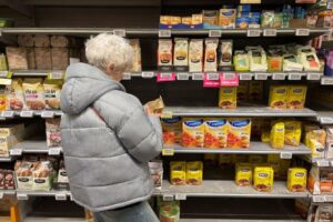 2022年4月1日,顾客在比利时布鲁塞尔的一家超市选购面粉。(新华社记者郑焕松摄)