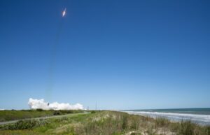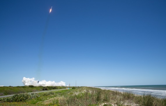 4月8日,“龙”飞船搭乘“猎鹰9”号火箭从美国佛罗里达州肯尼迪航天中心发射升空。新华社发(美国航天局供图)