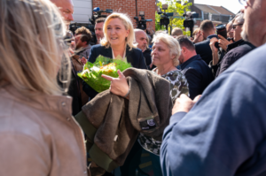 4月24日,法国极右翼政党“国民联盟”候选人勒庞(中左)在埃南-博蒙的一处投票站投票后向民众致意。新华社发(萨拉·阿勒卡莱摄)