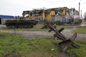 4月22日,在马里乌波尔,一辆装甲车停在受损建筑旁。新华社发(维克托摄)