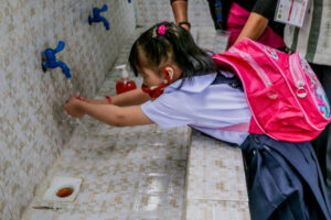 2021年12月6日,在菲律宾奎松市一所小学,一名学生在上课前洗手。新华社发(乌马利摄)