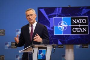 3月4日,在比利时布鲁塞尔,北约秘书长斯托尔滕贝格在北约外长会议后出席新闻发布会。新华社发(北约供图)