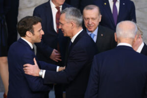 3月24日,在比利时布鲁塞尔的北约总部,法国总统马克龙(左一)、北约秘书长斯托尔滕贝格(左二)、土耳其总统埃尔多安(左三)在会议期间参加合影仪式。北约当天召开特别峰会讨论俄乌冲突。(新华社记者郑焕松摄)