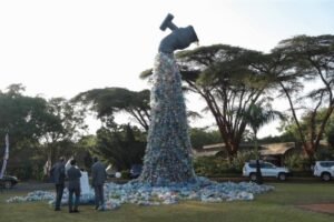 3月2日,在肯尼亚首都内罗毕,第五届联合国环境大会续会的参会代表观看一件艺术品,该艺术品展现了一个水龙头中流出的塑料瓶。新华社记者龙雷摄