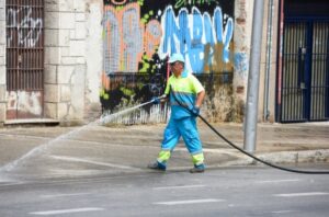6月15日,在西班牙马德里,环卫工人为街道冲水降温。新华社发(古斯塔沃·巴连特摄)