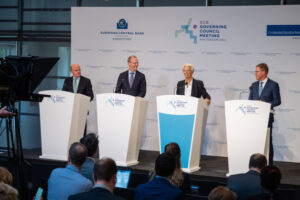 6月9日,在荷兰阿姆斯特丹,欧洲央行行长拉加德(右二)在新闻发布会上讲话。欧洲中央银行9日宣布,计划7月加息25个基点,并从7月1日起停止净资产购买。新华社发(欧洲央行供图)