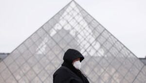 1月19日,一名女子走过法国巴黎卢浮宫的玻璃金字塔。新华社记者高静摄