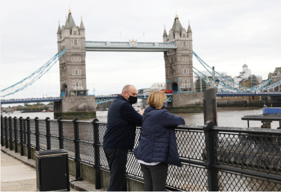 2021年10月23日,人们戴着口罩在英国伦敦塔桥旁休闲。新华社记者李颖摄