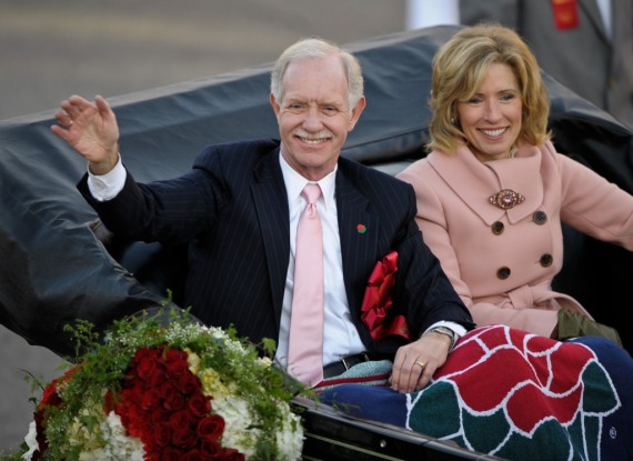 2010年1月1日,在美国加利福尼亚州帕萨迪纳市,曾经成功迫降纽约哈德孙河的美国航空公司机长切斯利·萨利·萨伦伯格(左)乘坐花车参加新年玫瑰花车游行活动。新华社记者戚恒摄