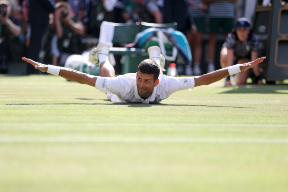种种波折甚至非竞技因素缠身,所幸温布尔登给了他“逆风翻盘”的舞台。四分之一决赛,焦科维奇在落后两盘的情况下3:2力克意大利新星辛纳。在决胜盘的一个回合中,塞尔维亚人飞身救球成功,在得分的瞬间趴倒在地面,双臂展开,显现出“飞翔”的动作。