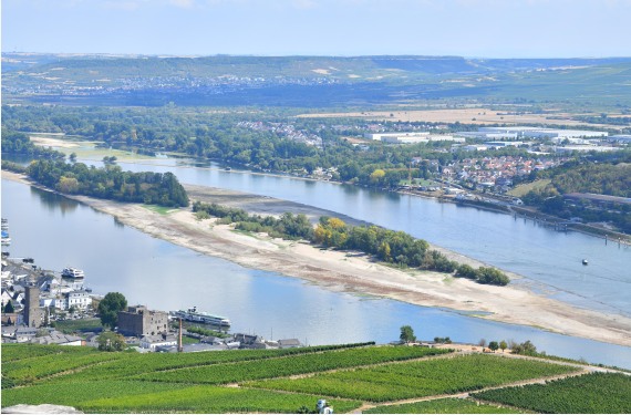 这是8月16日在德国黑森州吕德斯海姆拍摄的莱茵河。受近期持续高温干燥天气影响,莱茵河在德国境内多段出现不同程度水位下降。(新华社记者任鹏飞摄)