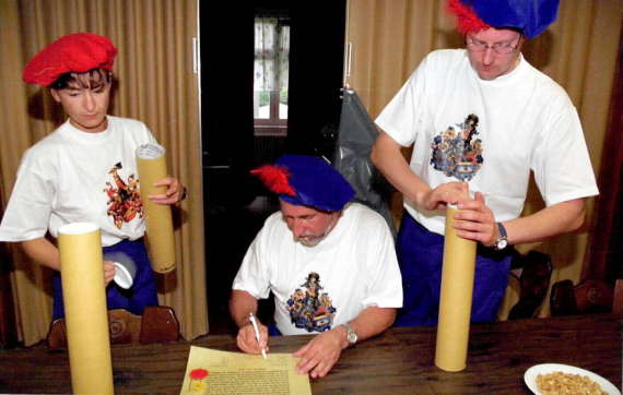 2000年7月7日,德国联邦印刷所在柏林举行了独具特色的传统学徒期满、洗旧立新仪式。图为师傅在徒弟的“结业”证书上签字。新华社记者郭勇摄(传真照片)