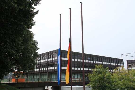 2012年9月5日,在德国慕尼黑,昔日慕尼黑奥运村入口处降半旗志哀。新华社记者宋国城摄