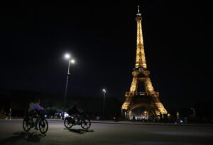 这是9月22日拍摄的亮灯的法国巴黎地标性建筑——埃菲尔铁塔。为配合法国节能计划,巴黎埃菲尔铁塔从9月23日起将在23时45分熄灯,比往常提前一个多小时,以节约用电。埃菲尔铁塔通常亮灯到凌晨1点。(新华社记者高静摄)